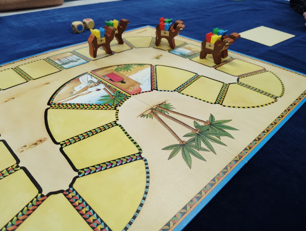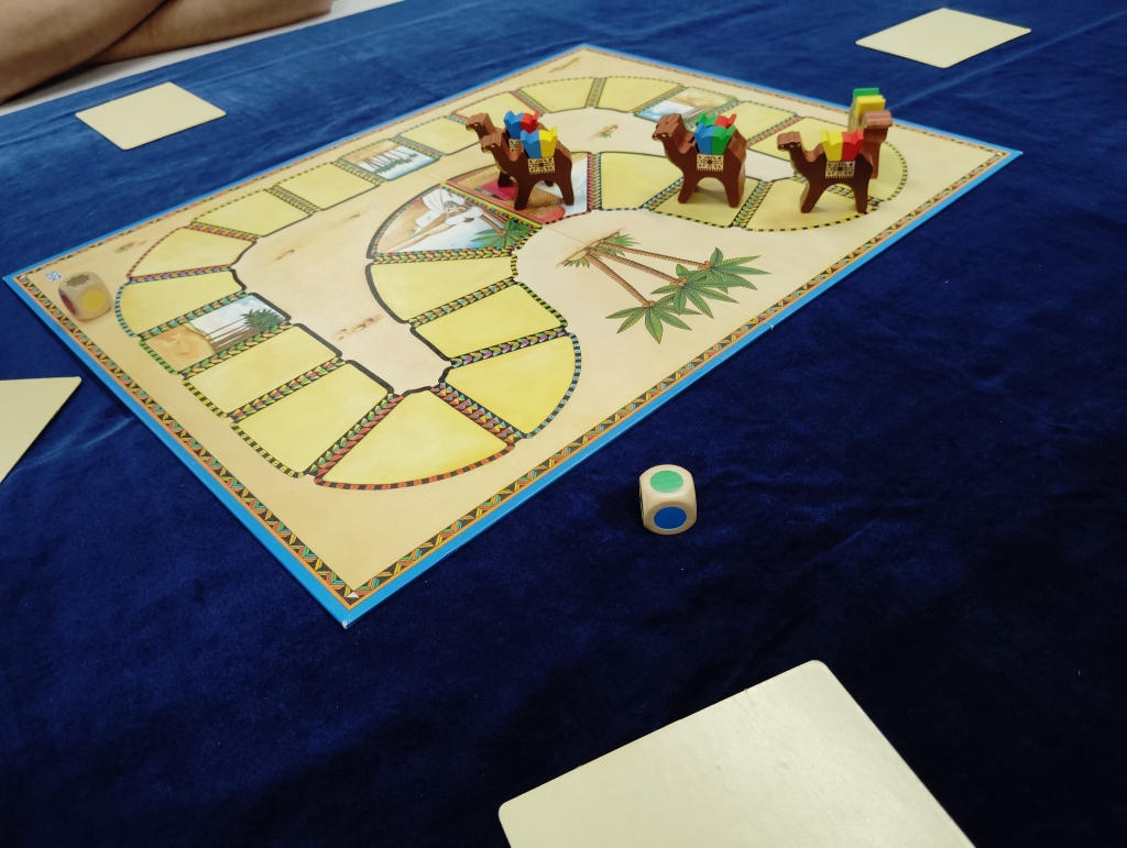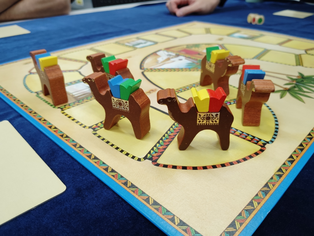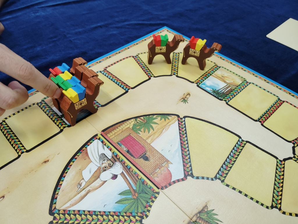 各ラクダには2色の色があり、青が出たなら青があるラクダなら選んで進めることができ自分のラクダがバレないように他のラクダを進めたりすることができる。