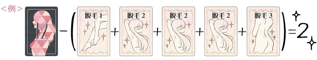 | ☆処理残しが少ないほどかわいい 自分のムダ毛カードの数字から、手札の脱毛カードの数字の合計を引いた数が処理残しです。処理残しが0~2点だとかわいいとされ、0点が最もかわいく、1点が2番目、2点が3番目にかわいいです。処理残し0点未満の人は肌荒れブス、3点以上の人はムダ毛ブスなのでかわいくはありません。 例えば次のような手札の場合は、処理残しは2点です。かわいいですね○