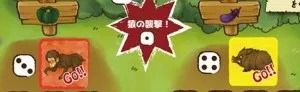 1種類の野菜の畑マスが新芽チップで埋まった時、その野菜は収穫され、野菜タイルは保存庫に移動します。ただしのそれ以後、その野菜のサイコロの出目はケモノ(サルあるいは猪)襲撃の目となります。