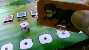 もしサイコロに1の目があれば、サル駒を矢印の方向へ1マス動かします。1の目が2つある場合は、サル駒は2マス動かし、手番のプレイヤーは任意の野菜の畑マスか、猟師マスに新芽チップを一枚置くことが出来ます。収穫後のケモノのサイコロ目も出た場合、同様に、ケモノ駒(サル、猪)を動かします。