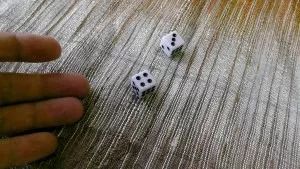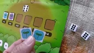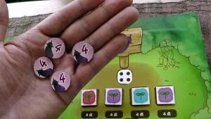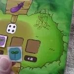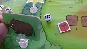 手番ではサイコロを2個、振ります。2つのサイコロの目から一つを選んで、新芽チップを畑マスに植えます。もしそこにケモノの足跡があれば、イノシシ駒をボード中央に向かって1マス進めます。