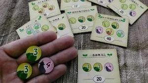 1種類の野菜の畑マスが新芽チップで埋まった時、新芽チップを置いていたプレイヤーには、チップごとにその野菜の得点チップが配られ、配置していた新芽チップも各プレイヤーに回収されます。