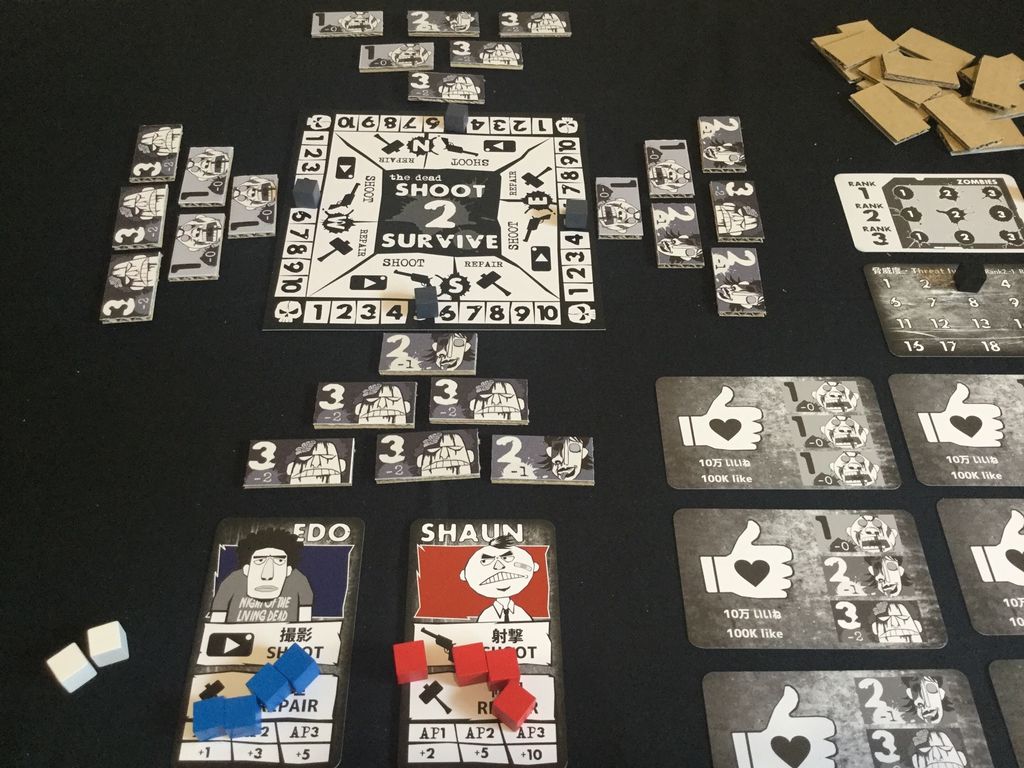 ゾンビのリアルタイム動画配信という世界観がおもしろい。アクションの手順や細かいルールがゲーム初心者には少し難しく(ゾンビ脅威度の増加はバリケード接触面数、減少は倒したゾンビのカード上指示数、ゾンビを倒すために必要なアクションポイント数とバリケード耐久力の減少数はゾンビのランク、など参照する数字が様々なので)ルールブック読み読みのプレイでしたが楽しめました。