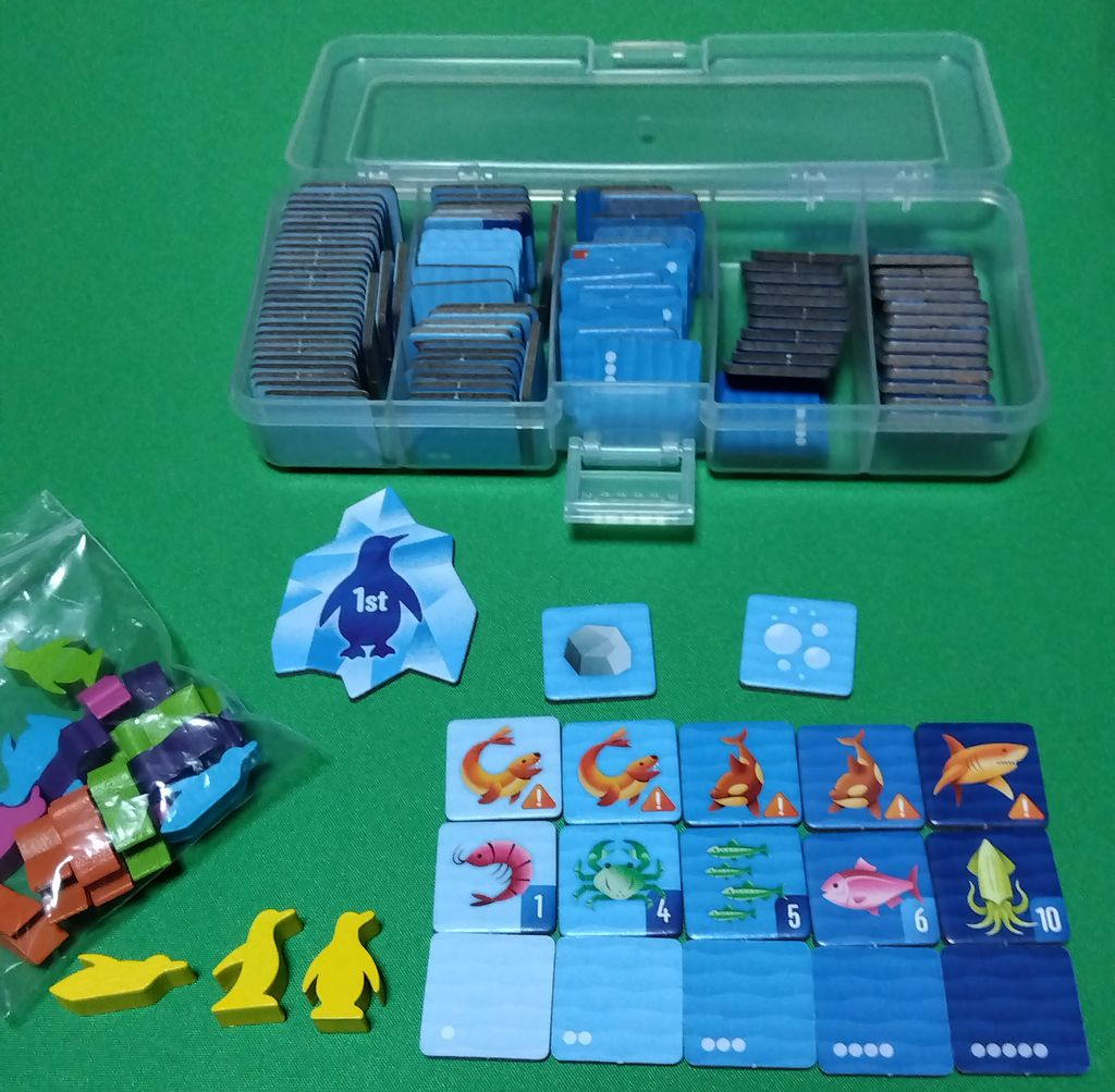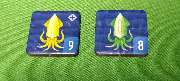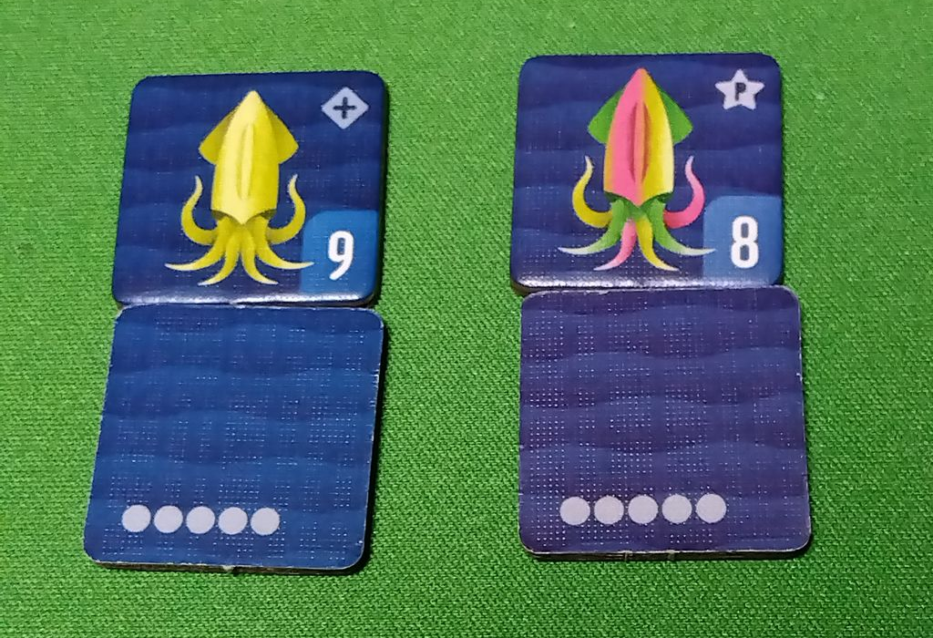 タイルは餌(3色)と捕食者、泡、岩の4種類。裏面で海の深さ(1~5段階)が分かるようになってます。あと1~3人までと4~6人で使用するタイル総数自体が違います。