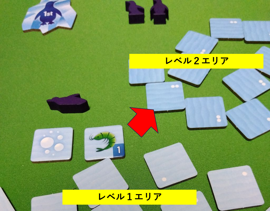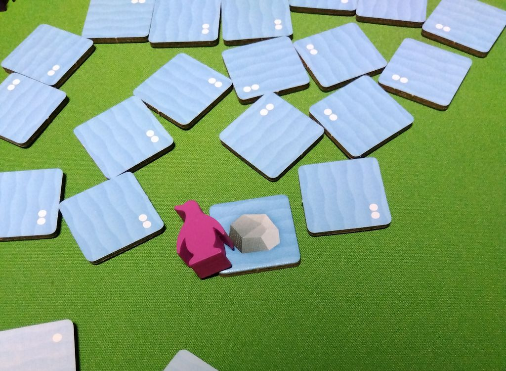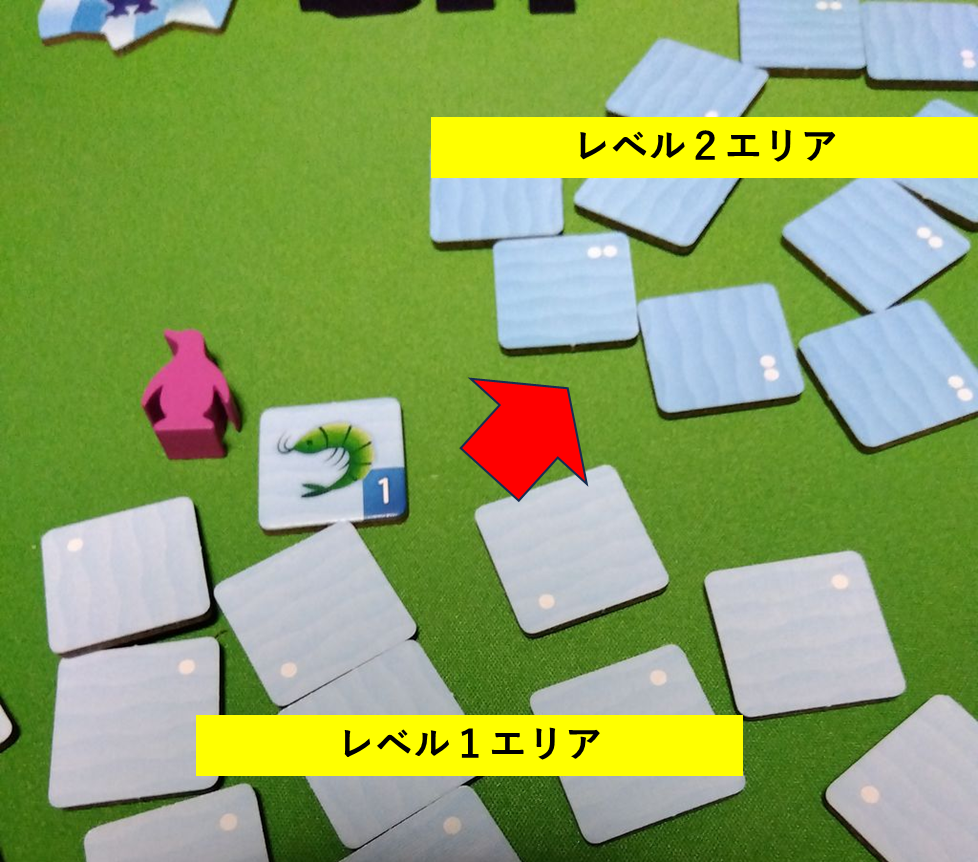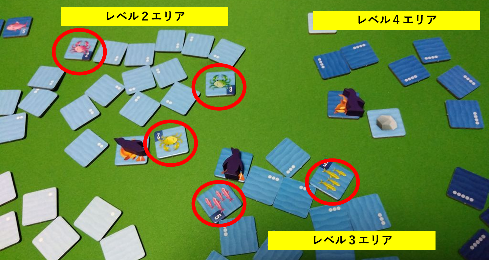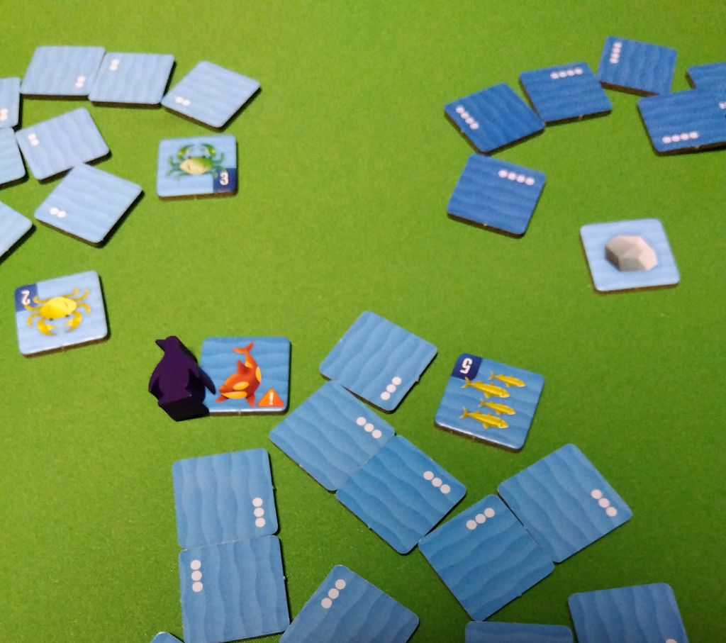捕食者:ペンギンは捕まってしまいます。コマを1つタイル上に置いて手番終了。次手番は捕まったエリアをスキップしてタイルをめくれます。(3で捕まったので、1→2→4と3をスキップできる)