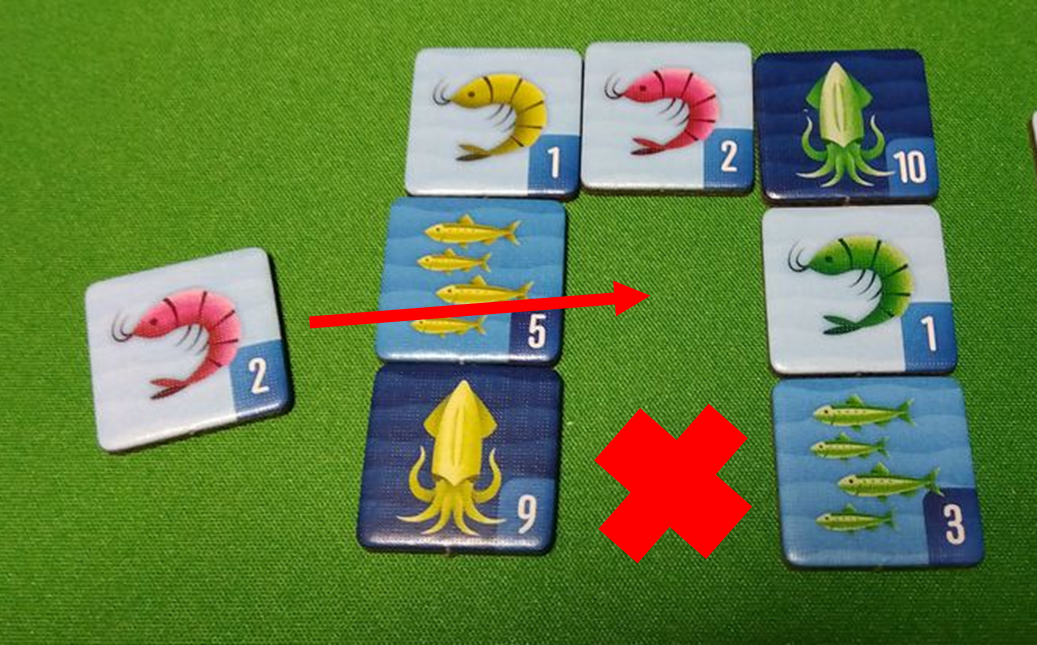 獲得した餌は色ごとに獲得した順番に並べます。順番は変えられません。下の写真で行くと、ピンクの餌2つ目なので、上から順に並べる。(セット的に×の位置に置ければ点は高いけど)
