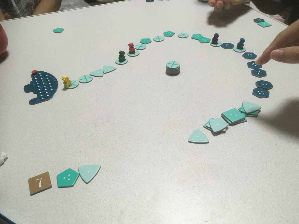 コンポーネントのかわいさ、シンプルさは群を抜いている。以前深くもぐり過ぎて潜水艦に戻ることができなかった苦い経験を踏まえ、今回は早く潜水艦に戻ることにした。しかし、早く戻りすぎて点数を逃すことに。周りの出方次第でしゃがむか進むか悩ましい。