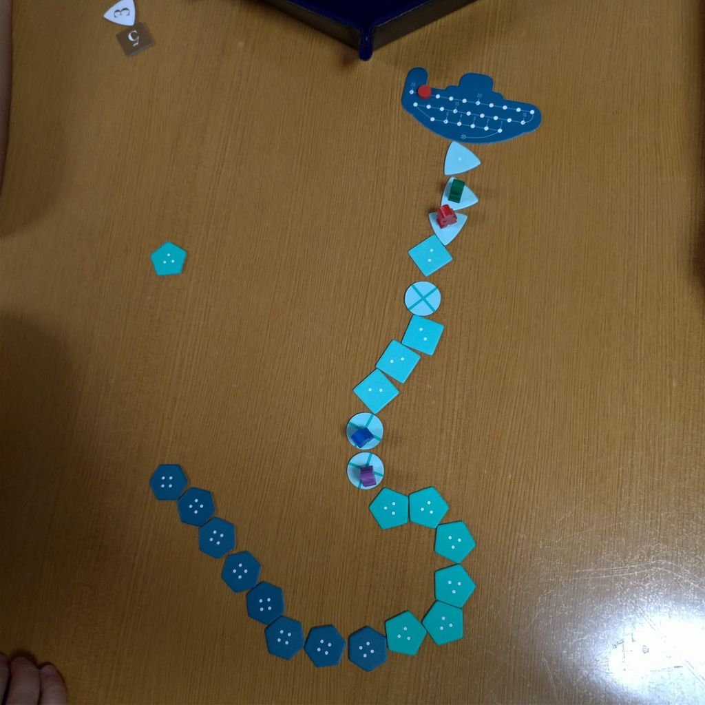 慣れてくると、潜水艦の戻る直前の遺跡チップを1〜2枚拾って、潜水艦の空気を減らして他のプレイヤーの邪魔をし、自分だけは潜水艦に戻って得点するというようなこともできるようになります。また、プレイヤーの人数が多いと、他の探検家コマが置いてある遺跡チップは移動の際にカウントしないので、例えば自分のいく先に探検家コマが4つ並んでいて、ダイズの出目が1でも5つ先のチップに行くことができます。このルールを使えば、意外と潜水艦から遠いチップのところまで行って帰ることもできます。