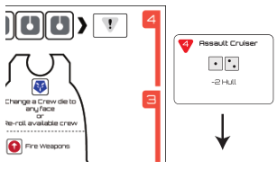 - 脅威の起動:脅威ダイスを振ります。脅威ダイスの目に対応した脅威すべてが起動します。脅威は起動した内部の脅威の上から下にすべて処理し、次に外部の脅威を処理します。船へのダメージは常にシールドから適用します。船体トラックが0に到達したら、船は破壊されゲームに敗北します。