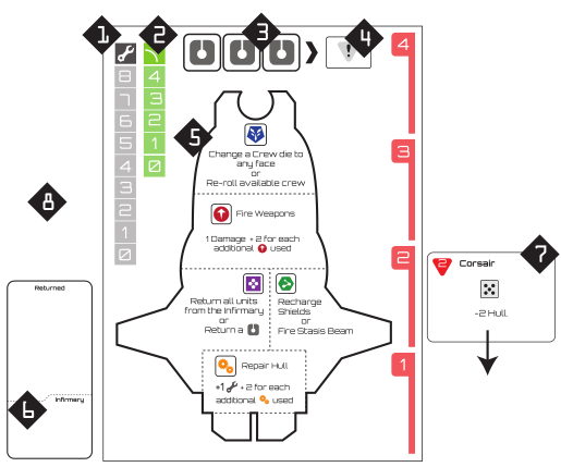 - 医務室(Infirmary):医務室にあるクルーダイスは使用不可能です。ここにあるダイスはステップ6で招集することができません。医療担当(Medical)を使用することで使用可能ダイス置き場(Pool)に復帰させることができます。