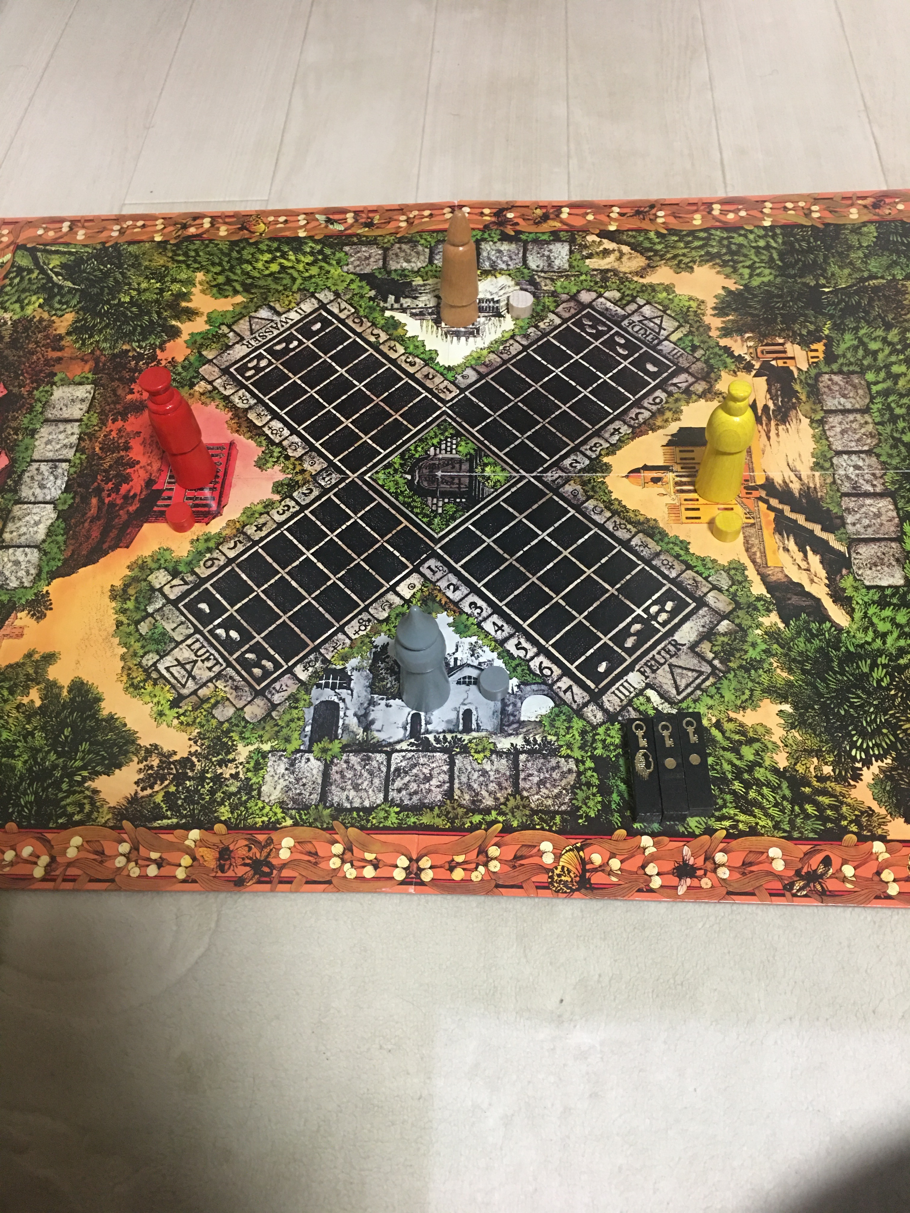 ゲーム盤には、中央正方形の牢獄の各辺に長方形の区画が付いた大きな十字の図形が描かれています。価格と区画の間には、4つの駒の出発地があります。王の城、女王の城、僧の修道院、盗賊の廃墟です。出発地の色は、駒の色と同じになっています。その下には、5つの石畳の道があります。道はそれぞれ跡切れていますが、次の道と繋がっており、駒はその上を時計回りに進みます。