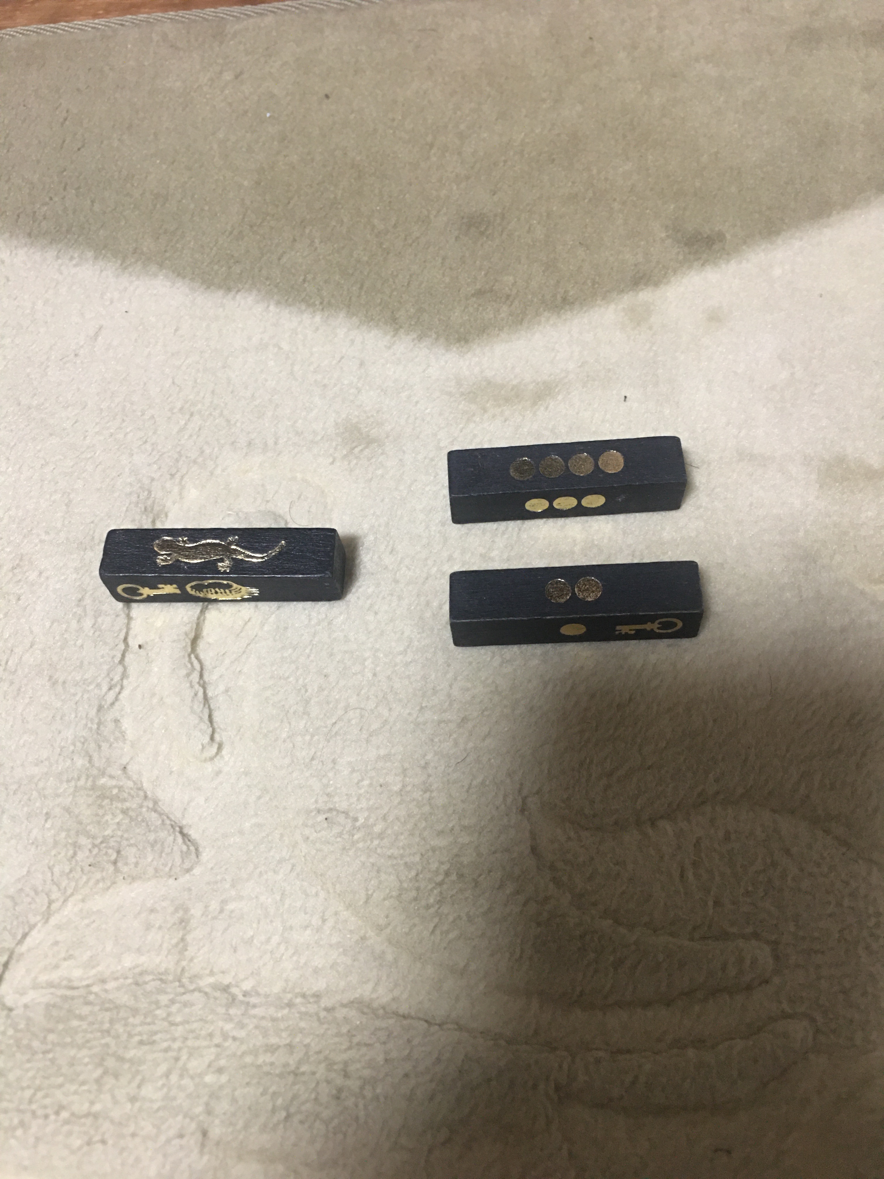 杖は進行のための1〜4までの数が表されているのが2本、絵が描かれているのが1本あります。プレイヤーはこの3本を同時に振りますが、まず絵の杖の指示に従い、次に数の杖によって駒を動かします。