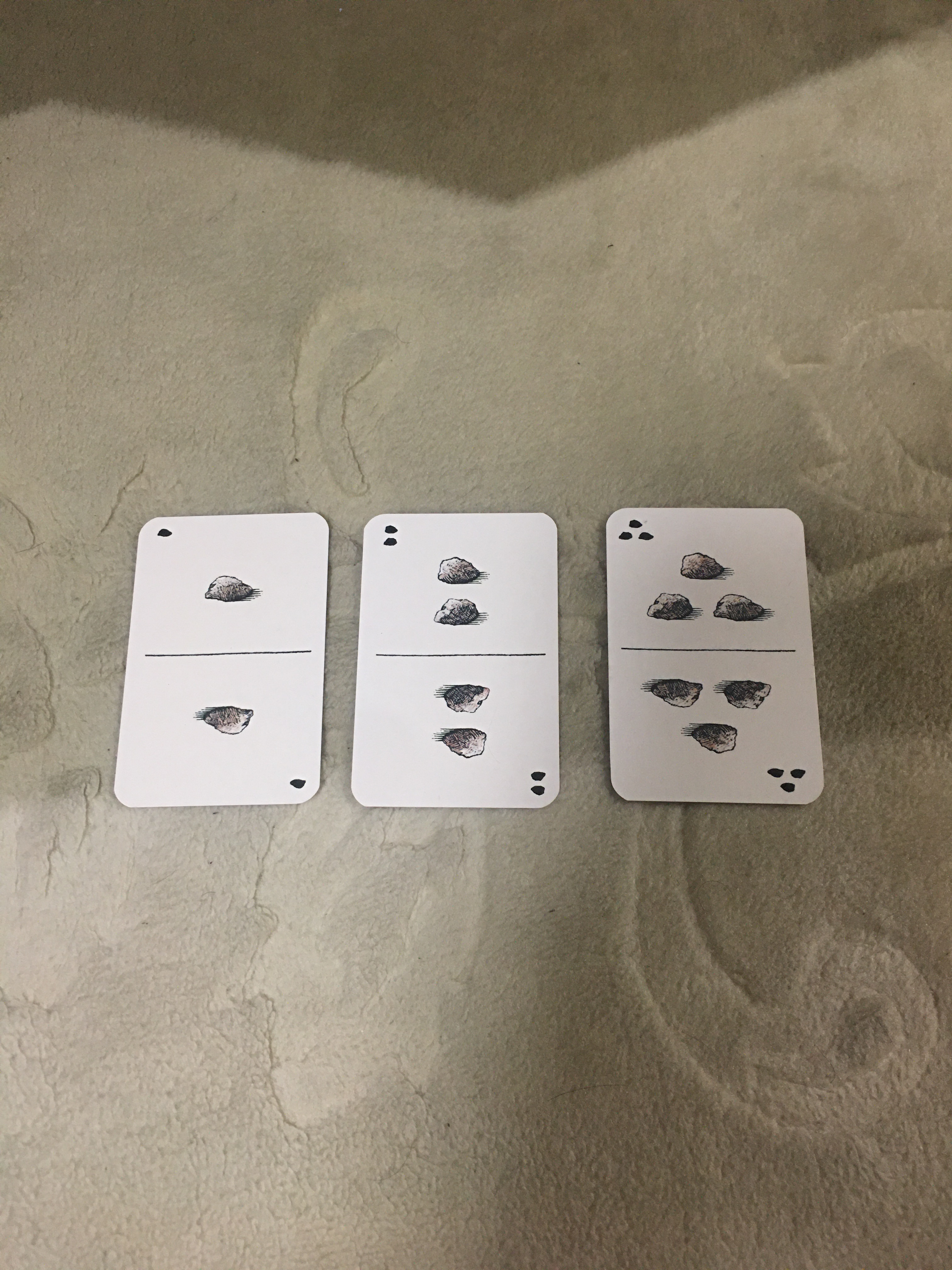 正しい時は、そのカードを差し出さなければなりません。発表したプレイヤーはそのカードを加えて、完成した組み合わせを自分の前にそのまま置き、点数をつけます。石の駒は出発地に戻します。