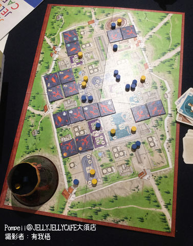 最初の噴火カードが出てからは追加で縁者ルールが入り、他プレイヤーのコマがあるところに自分のコマを置くと、縁者として追加でコマを一個置く事が出来ます。実はこのゲーム、まとめてコマを置くのが重要で、まとめて1マス(1建物ではないです)に置かれたコマの数だけ1個のコマをまとめて動かせるのです。つまり、古代ローマ社会はぼっちには厳しい社会だという事です。泣こうな。