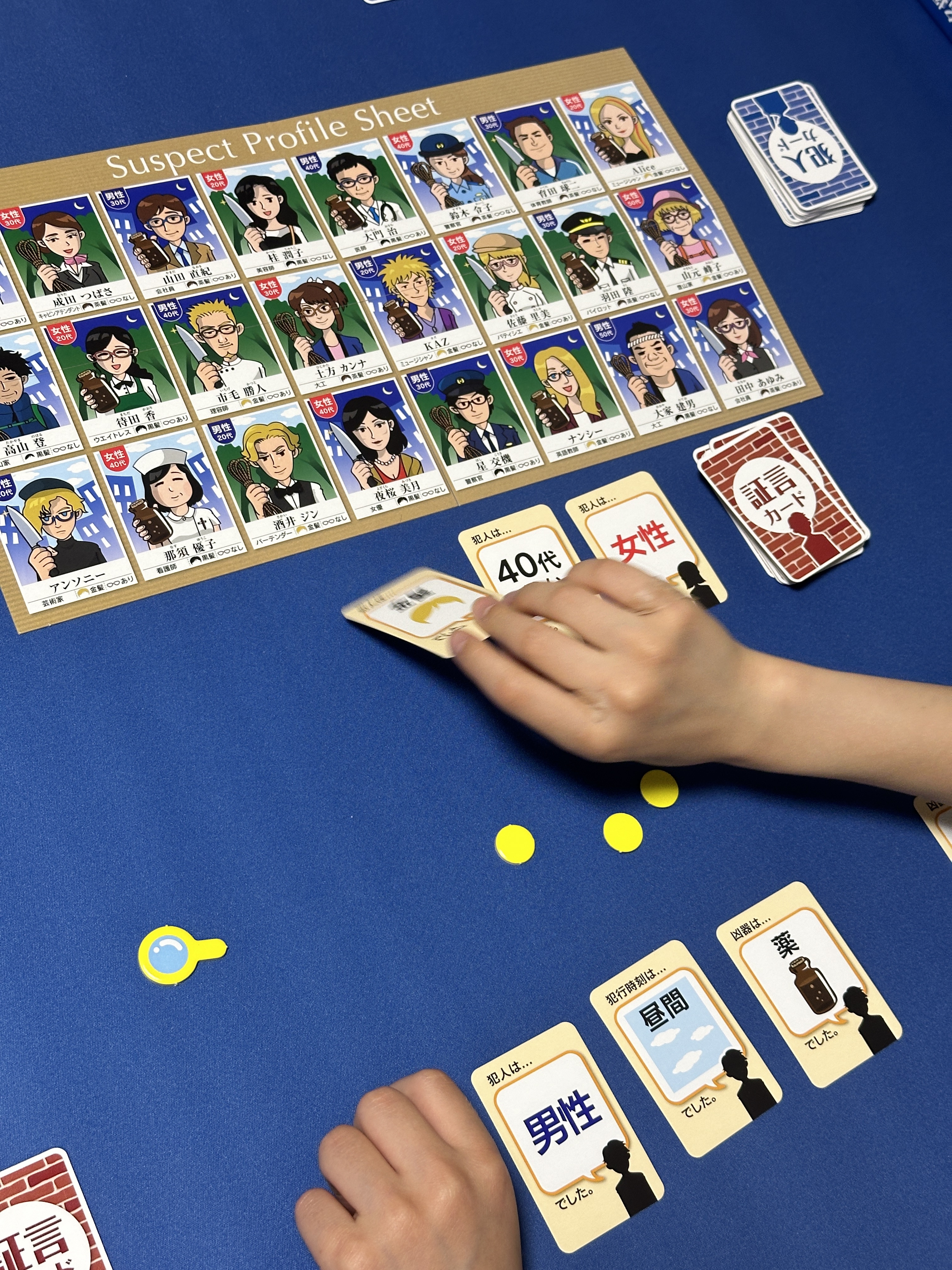 髪色や性別、年齢、凶器などが描かれた証言カードを使って犯人の特徴を絞り込み、容疑者の中から1人の真犯人を特定するゲームです。
