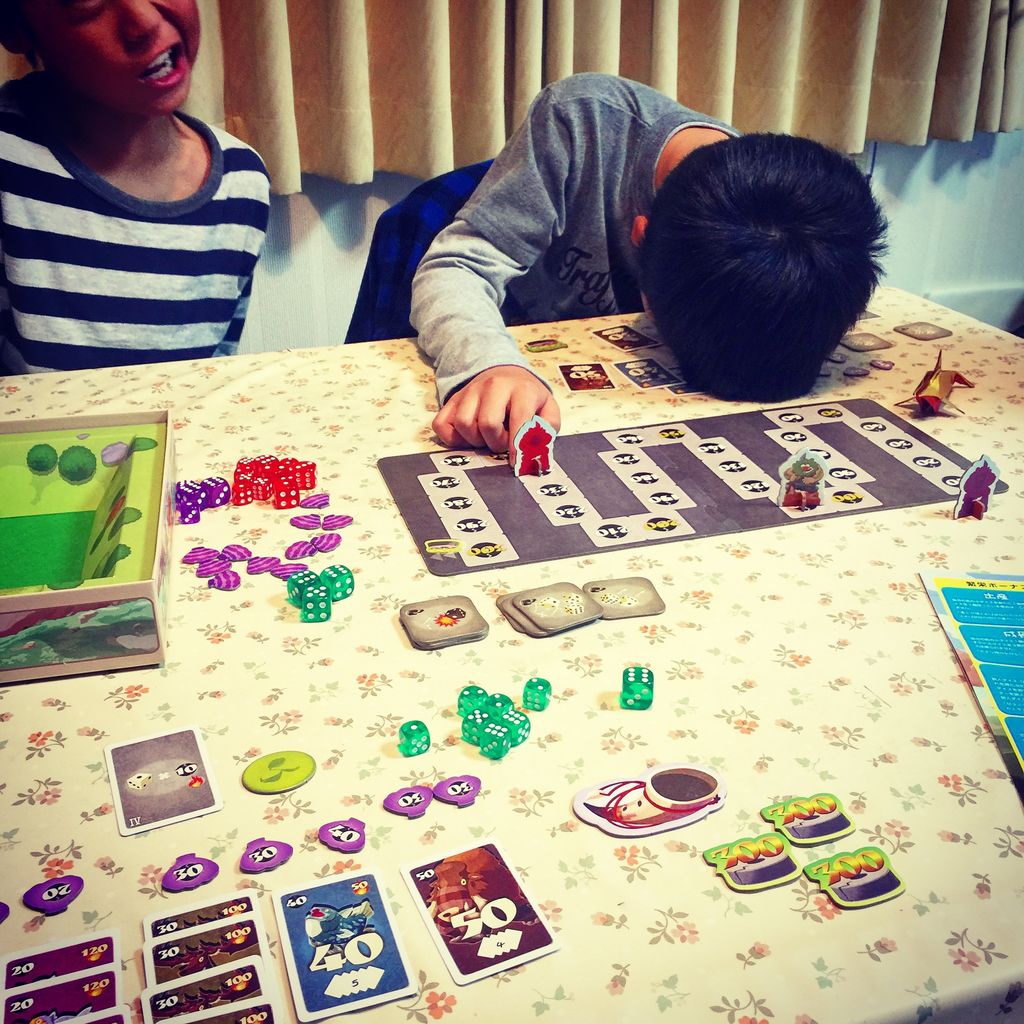 今回はムスコくんも各獲物の1位ボーナスが大きいのを理解しての立ち回り……をするかと思いきや、友達とのダイスの置きあいに終始してしまい、二人が潰し合う隙を突いてカードを集めまくった僕が400点以上の差を付けて勝利。大人の貫禄を見せつけてやりました。