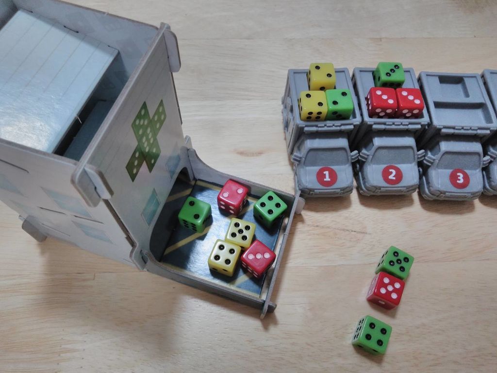 それから、最後の手番の人が患者を1番~(プレイヤー人数+1)番の救急車にダイスの出目によって小さい数字から大きい数字へ乗せます。