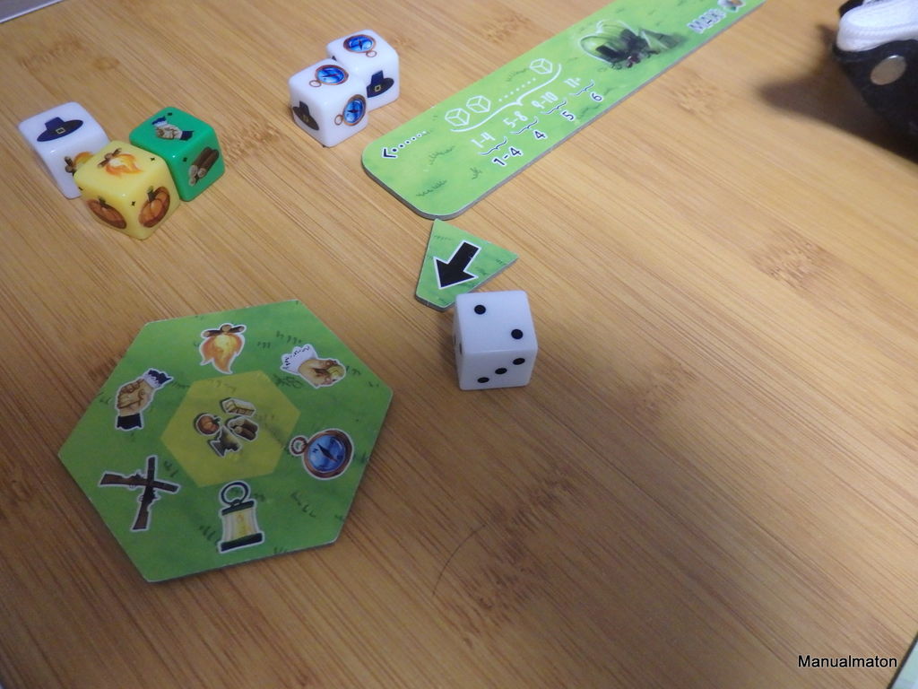 イラストの雰囲気やマップの地勢、そしてアクション「研究」で得られる技術(『明白なる使命』や『ゴールドラッシュ』など)からしても、開拓当初のアメリカを舞台にしていることは明白。プレイヤーは新大陸に入賞してきたばかりの開拓者。そんな新天地をダイスを用いて