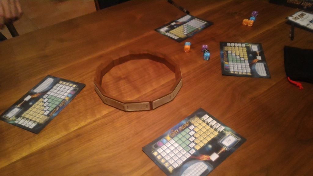 色々なカラーのサイコロがあったり、プレイシートも華やかなアートワークだが、ゲームの中身は自分の欲しいサイコロの目を獲得する事も大事だが、他のプレイヤーに嫌な状況を押し付ける(このサイコロ残しても取れないよね~など)やることは結構渋い硬派なゲームという印象です。