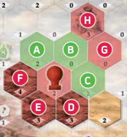 例: 赤プレイヤーは、スペースA、B、Cのいずれかにタイルを置くことができます。 スペースD、E、Fはすでに地形タイルが配置されているため、気球に隣接していても、新しいタイルをそこに配置することはできません。 気球の現在位置に隣接していないため、スペースGとHにもタイルを配置できません。 また、気球が現在いるスペースにタイルを配置することもできません。 |