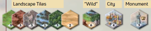 すべての地形タイル(ワイルド、都市、モニュメントも含む)をバッグに入れ、よく混ぜます。次に、テーブル上の各雲に、バッグからランダムなタイル1枚を引き、表向きに配置します。