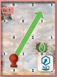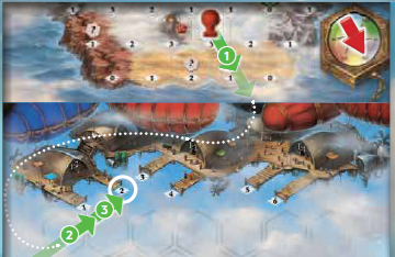 プレイヤーは通常、気球が現在いるスペース/タイルに示されている数だけ、方向ダイスの方向に気球を移動させます。エネルギーを使用することで、気球の方向と飛行距離の両方を調整できます(例1を参照)。