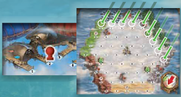 各プレイヤーは、金色のコンパス面を上にした島ボード(モジュール1の場合)と、金色の面を上にしたエネルギートラックボード(モジュール1の場合)を受け取ります。エネルギートラックボードを島ボードの上に配置します。