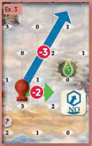 プレイヤーが方向ダイスで指定されている方向以外の方向に気球を動かしたい場合は、まずエネルギーを消費して速度を0まで「減速」する必要があります(すでに「0」のスペース/タイル上にいる場合を除く)。その後、プレイヤーが新しい方向に移動したい1スペースごとに2エネルギーを追加で消費する必要があります(例3を参照)。 |