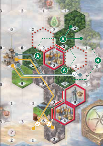 例: 海岸は任意のタイプの地形タイルを通じて気球ヤードに接続されているだけで十分であるため、砂漠の海岸と山の海岸は気球ヤードに接続されていると見なされます(黄色と灰色の線を参照)。ただし、値4の都市タイルと値5のモニュメントタイルが元の山の海岸スペースを覆っているため、これらのスペースを出発点として気球ヤードに接続することはできません。また、値3の都市タイルが森スペース(A)の間の接続をすべて遮断しているため、森の海岸は気球ヤードに接続されていません。 森の海岸と気球ヤードを接続するには、赤の点線でマークされたスペースのいずれかに、任意のタイプの地形タイルを配置する必要があります。もしくは、隣接する山の海岸を経由する接続経路(緑の点線B)も考えられますが、これらのスペースがまだ地形タイルで覆われていないため、現在は不可能です。 |