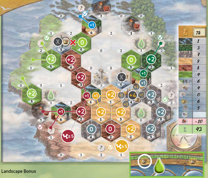 プレイヤーが5枚の拡張タイルをすべて島ボードに配置した場合、追加の5勝利ポイントを獲得します(タイルに記載されている勝利ポイントに加えて)。