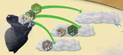 各ラウンドの開始時(最初のラウンドを除く)に、スタートプレイヤーはバッグからランダムに地形タイルを引き、各雲に1枚ずつ配置します(前のラウンドのタイルがまだ残っている雲にも)。ただし、各雲に配置できるタイルは最大3枚までです。 |