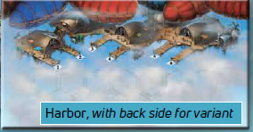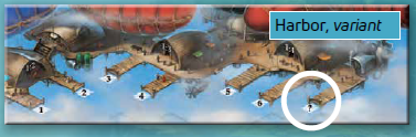 港ボードの裏面には、ドック#1-6に加えて、「?」マークが付いた追加の7番目のドックが描かれたバリアント用の港があります。このドックから気球の移動を始めたプレイヤーは、気球を島ボードの任意のスペースに移動させることができます。 |