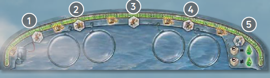 一番最近、空の旅をしたプレイヤーがスタートプレイヤーとなり、エネルギートラックの「5」スペースにエネルギーマーカーを置くことで、5単位のエネルギーを持ってゲームを開始します。時計回りに次のプレイヤーは6エネルギーから、3人目のプレイヤーは7エネルギーから、4人目のプレイヤーは8エネルギーからスタートします。 |
