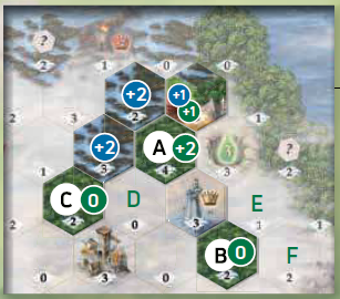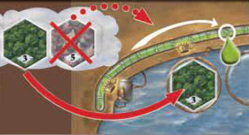 例: プレイヤーは、値3の森タイルと値5の山タイルが置かれている雲を選択します。 彼は森タイルを望遠鏡スペースの1つに配置します。 彼は山タイルをバッグに戻し、エネルギーマーカーをエネルギートラックの前方に5スペース動かすことで5エネルギーを獲得します。 |