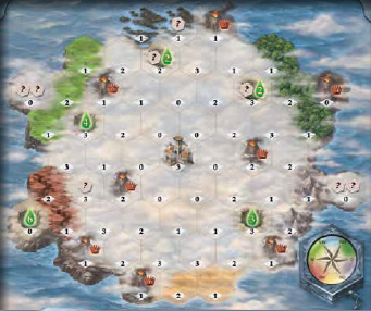 港湾事務所 気球を移動するときや、次のスタートプレイヤーを決めるときに、プレイヤーはこのタイルの値(1〜3)を選ぶことができます。 さらに、港湾事務所をアクティブ化すると、プレイヤーの気球は、自動的に海岸で停止するのではなく、通常の移動ポイントを使用して、島の海岸から港ボードに移動することができます(モジュール2を参照)。 その後、港では、プレイヤーの望遠鏡タイルを指定されたレートで港ボード上のタイルと交換することができます。 |