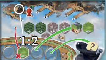 特別なケース: 望遠鏡にタイルがないプレイヤーが気球を港に移動させた場合、特別な交換レートは適用されず、気球がどのドックにいても、港ボードまたはバッグからタイルを1枚獲得することができます(望遠鏡から捨てることなく)。