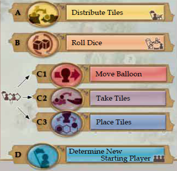 注意:フェーズB(ダイスを振る)は、スタートプレイヤーの右隣のプレイヤーが行います。フェーズC1、C2、C3は、最初にスタートプレイヤーによって実行されます。その後、時計回りの順番で、次のプレイヤー1人がこれらの3つのフェーズを連続して実行します。