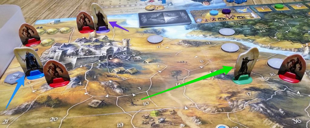 戦士 が 5 の井戸に行き、 射手 は橋を渡ってすぐの 11〜13 の霧のうち適当なのを解決、魔術師 は 17 の金貨 2 を拾って 18 の商人のところへ行くという作戦でいくことになりました。