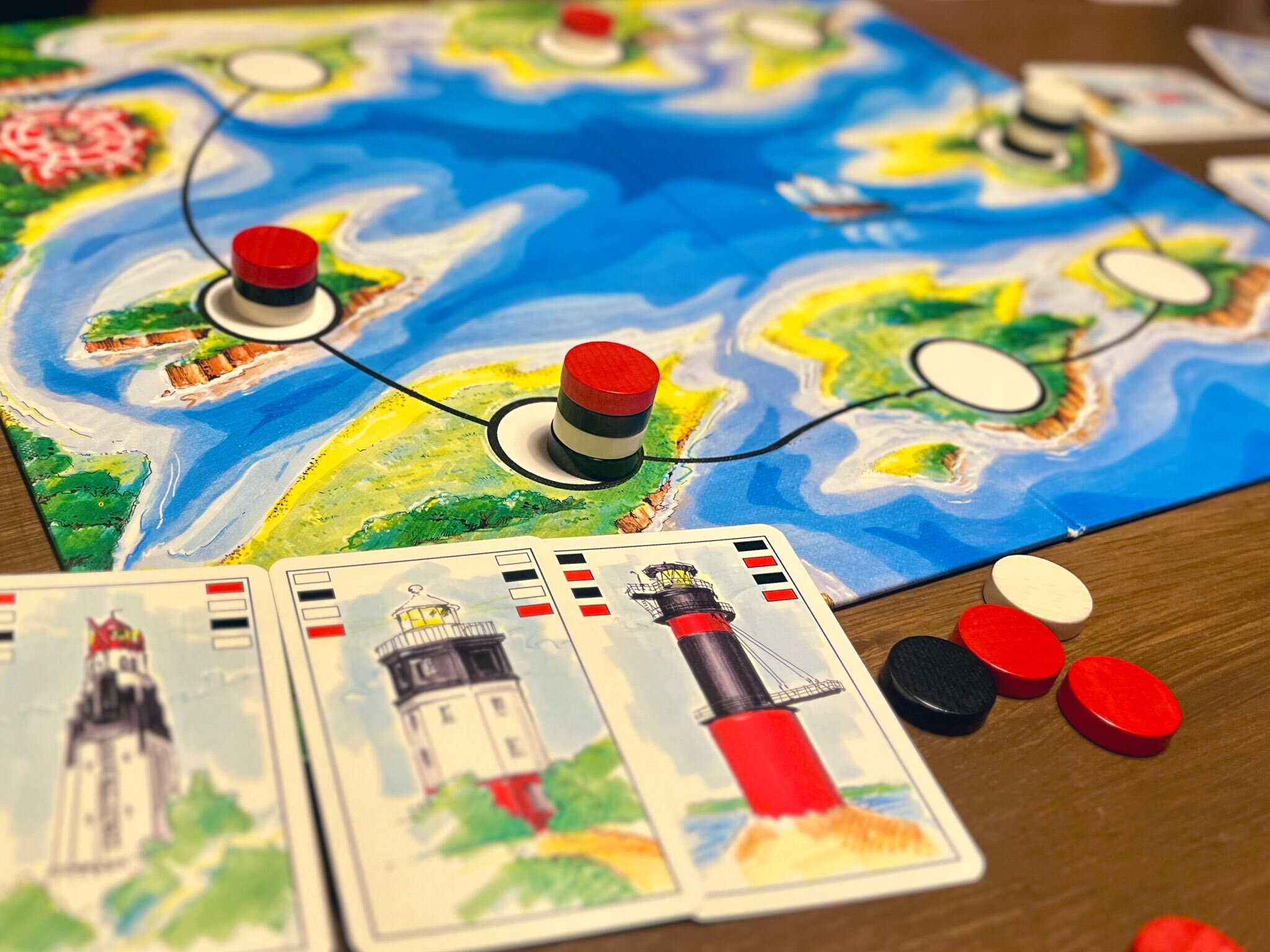 各プレイヤーがそれぞれ違う設計図を持って灯台の建設を行う。灯台のパーツは島から島へとぐるぐる移動して思惑通りにならない多人数アブストラクト風味。一向に完成しない灯台の設計図を眺めながら、月明かりの海で迷子になる船を想像する…