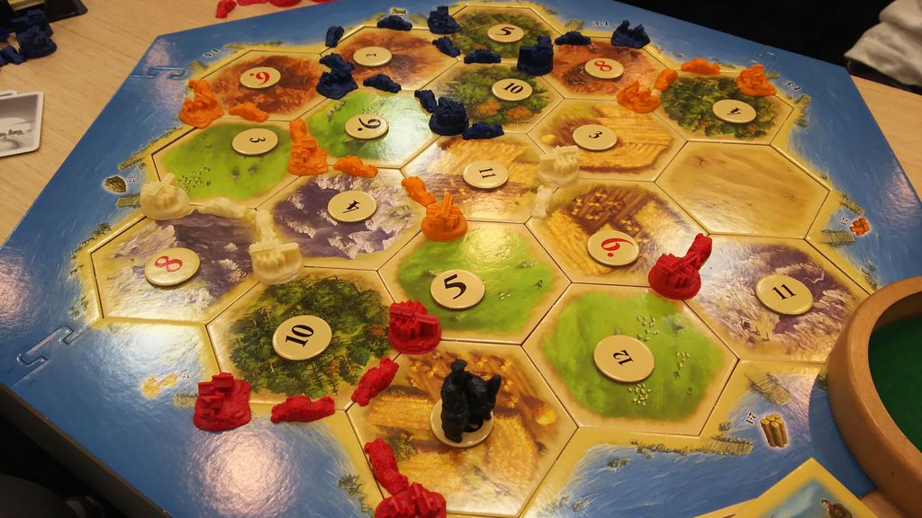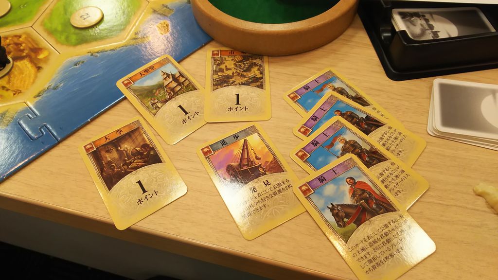 2回戦、白1番1位。青2番が大学の後輩、4番が見知り。鉄と鉄港の偏りから盗賊を加味してもの初手。場の掌握の為に麦が欲しい。青の返し91011からの麦地帯への道に煽られ2軒目を6麦11麦3麦に。都市化を急ぎ、中盤は発展カードの赤を放置し羊港の青を止め、終盤で騎士奪還。