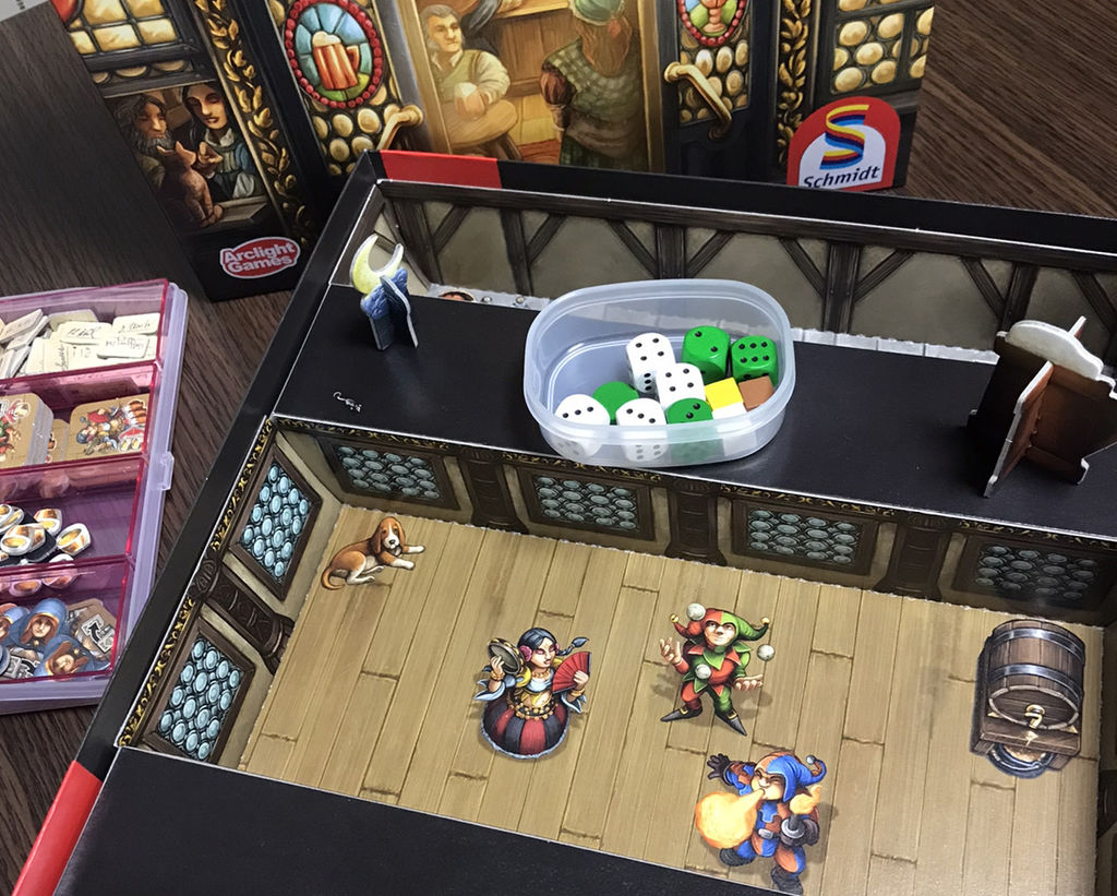毎ラウンド、他プレイヤーとのダイスドラフトや手札強化(設備強化や上質なお客の呼び込み)を行い