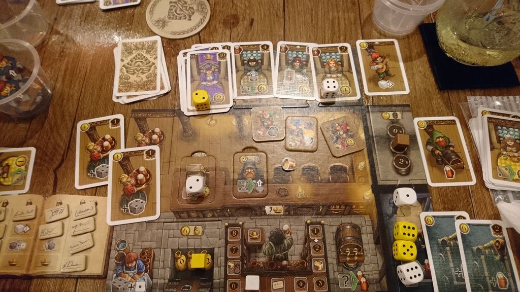 ラウンドボーナス的に得られる「シュナップス」トークンと芸人タイルにより2金・3ビールの産出が容易になるので酒場のアップグレードの速度が早まったり、高めのビールや金のカードに手が届きやすく、さらにはお客さんの除外や貴族付きのアップグレード、ダイスの任意操作、捨て札になるカードからテーブルでも納入業者でも一枚だけ戻せるなどわかりやすく強力。