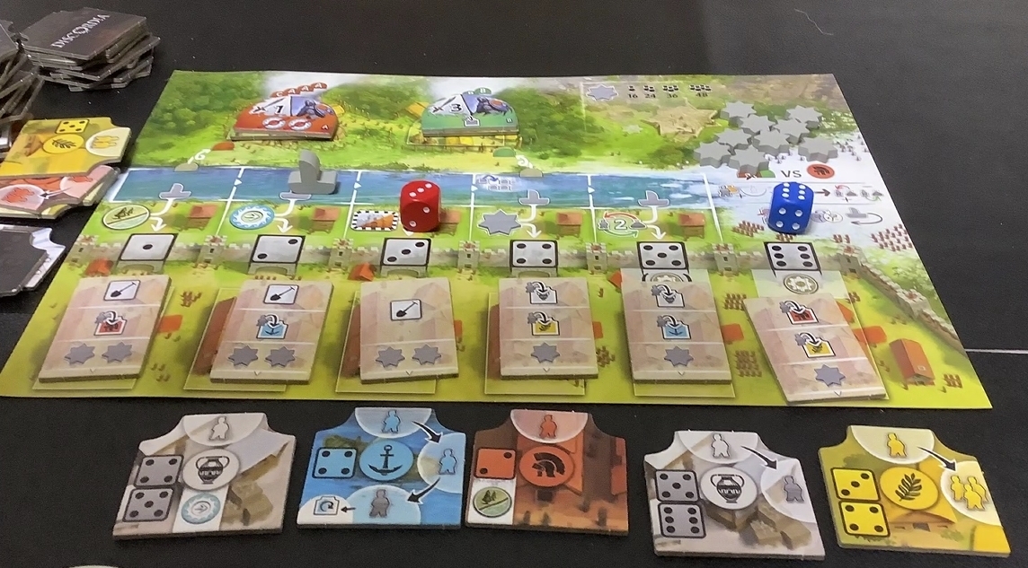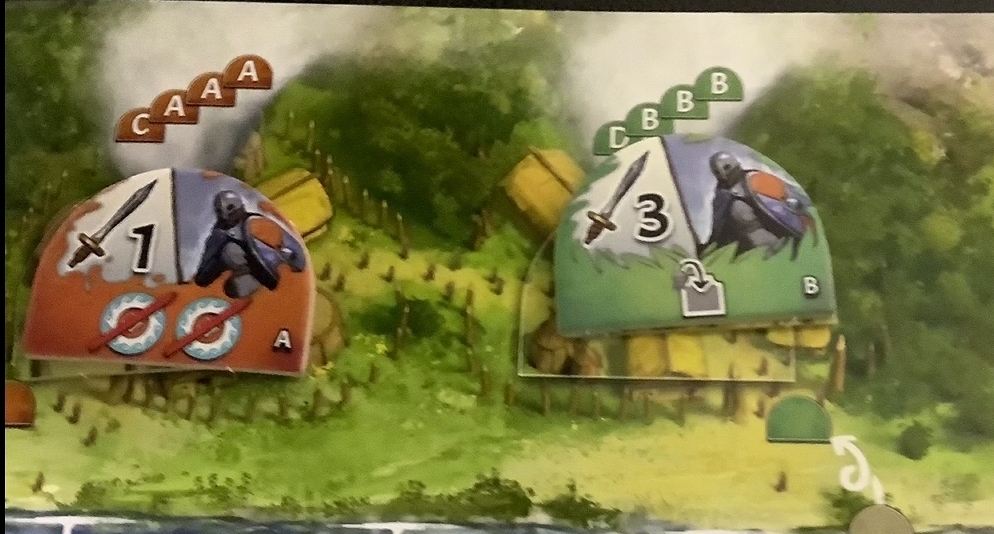 都市の個人ボードに配備されている兵舎(赤タイル)に人員が満たされている場所の人数が戦力となります。(なので右のタイルは2人不足しているのでカウントされません。(ちなみに上にある赤いタイルは砦という特殊タイルですが、こちらは人員配置できるタイルと配置しただけで効果が出るタイルがあます)