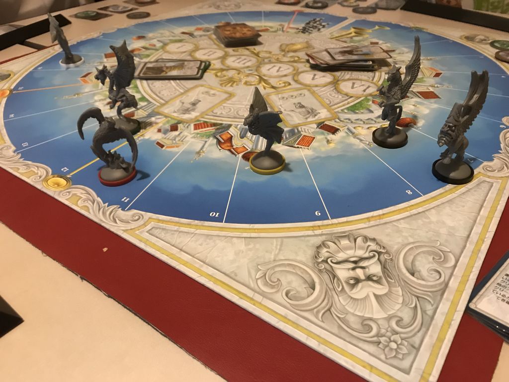 ゲームの準備として、ボード上には円周のコースがあってそのスタートラインに幻獣のフィギュア6つがあります。そして、特徴的な準備が手札の立てかけを隣のプレイヤーの間に置いて、そこに手札を置きます。そうすることにより各プレイヤーには左右2つの手札があるような状況になります。