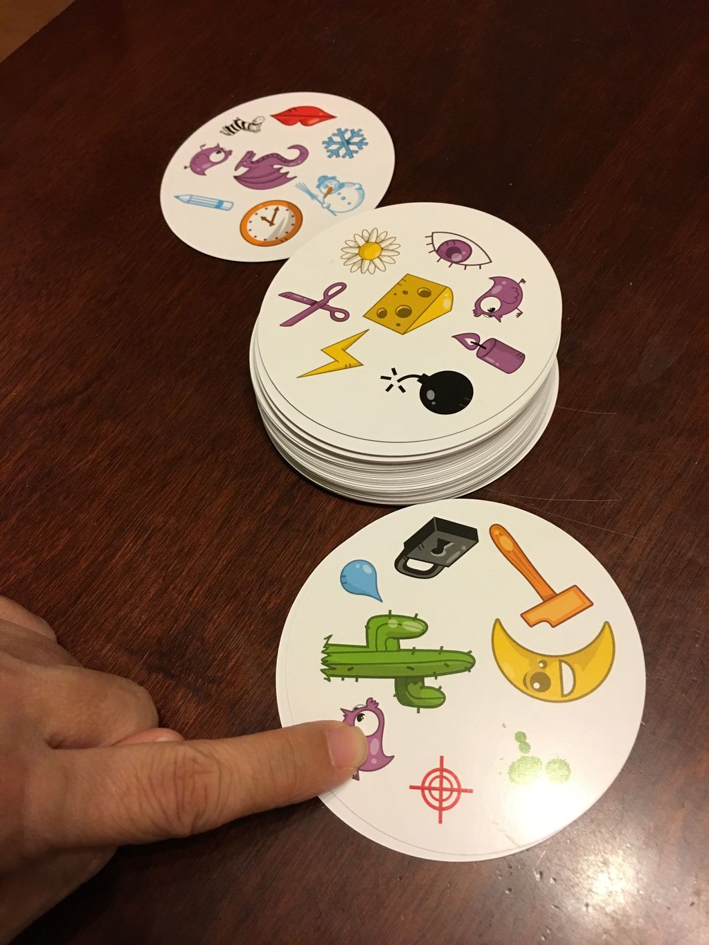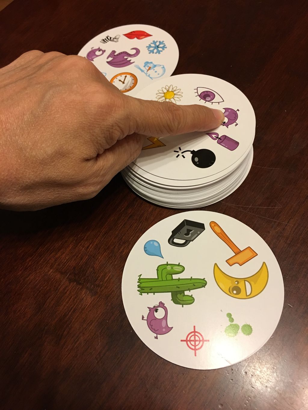 みつけたら、正式ルールだと絵の名前を叫ぶのですが、我が家では、山札の絵→手札の絵の順で「ポン、ポン」と指差します。一番はじめに山札の絵を指差した人がそのカードをもらえます。