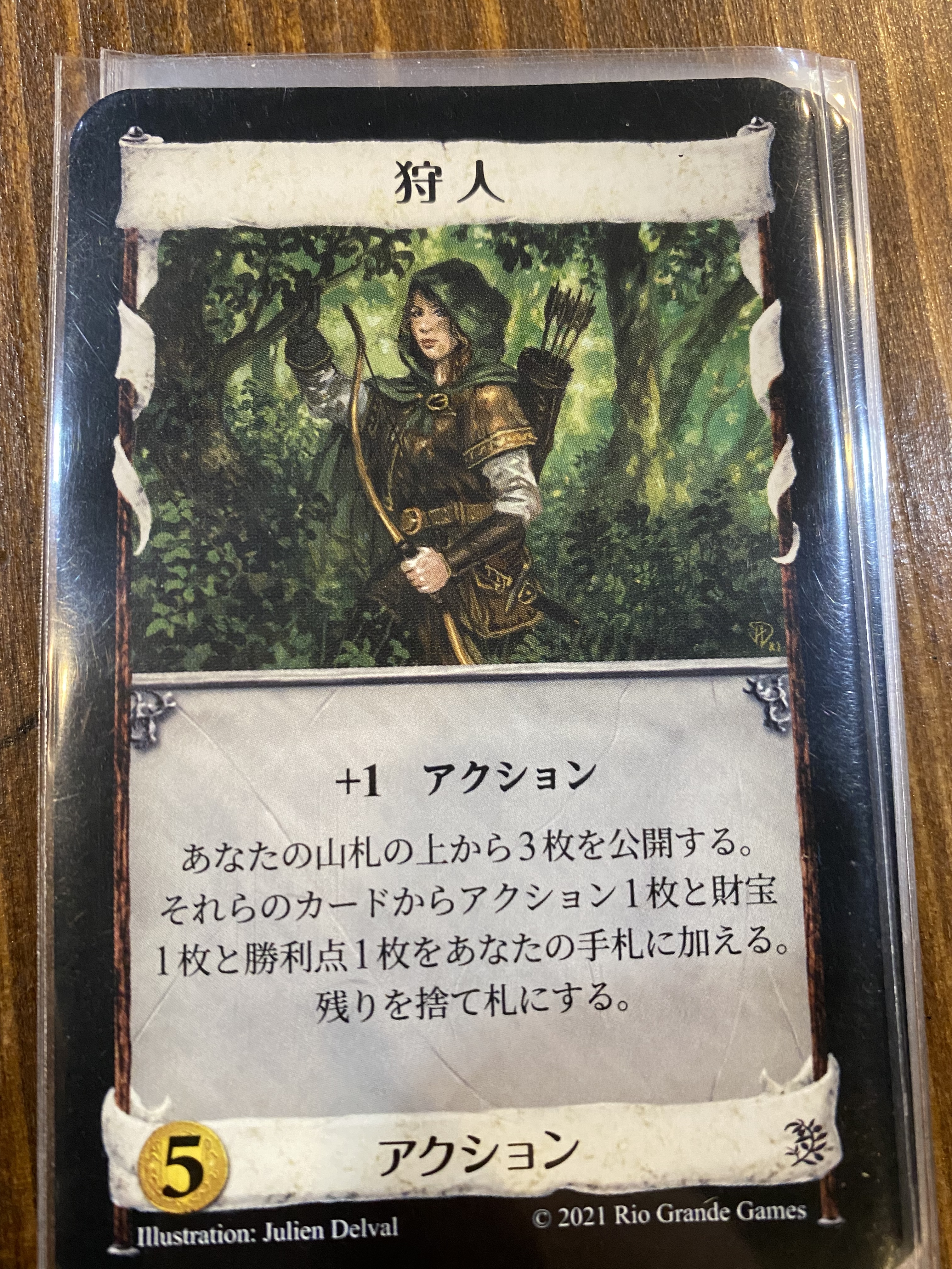 狩人は、アクションをガンガン打っていくドミニオンのシステムとはまた違った、アクション+財宝+勝利点をサーチするカードで、これまでとは違ったデッキ構築を可能とするものです。