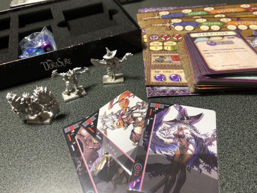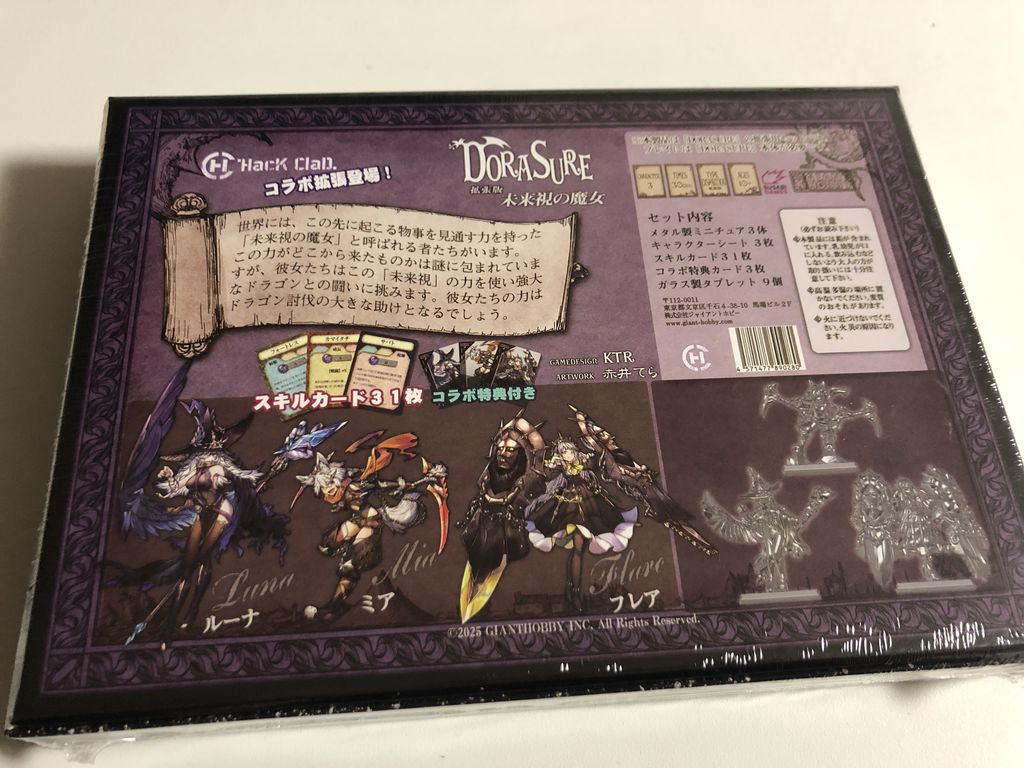 単独プレイヤーです。「DORASURE 拡張版 未来視の魔女」第16弾拡張セット、拡張版なので基本セットがないと遊べませんのでドラスレ未経験者などは特に注意しましょう。ドラスレはダイスロールしながら冒険者を育成し、最終ドラゴンを退治するお話。別のボドゲのハッククラッドとのコラボ作となっていて、未来視の魔女、フレア、ミア、ルーナが参戦。ストーリーとか特に問題無いのでハッククラッド知らない人でも問題ないです。