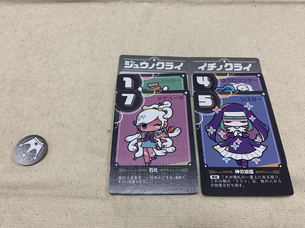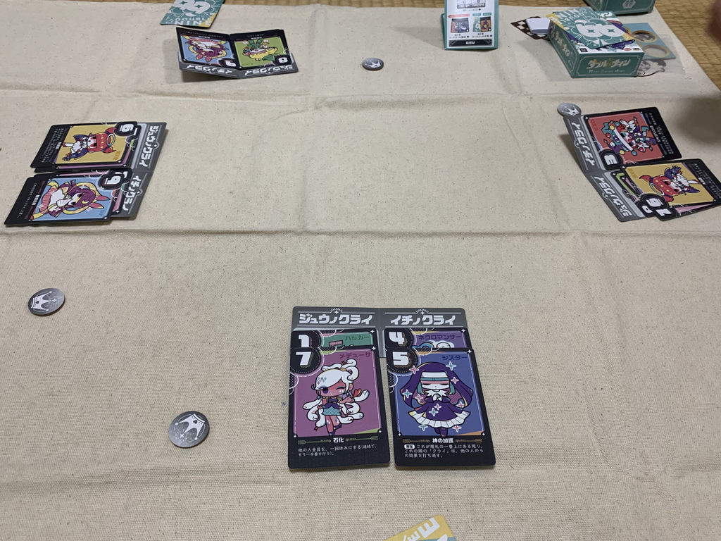 1枚手札がある状態から、もう1枚カードドローして、片方をプレイし、プレイしたカードの効果が発動する、ラブレター方式のゲーム。