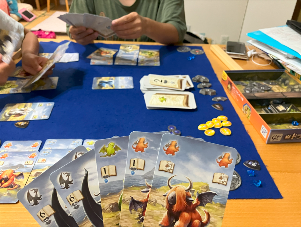 家で改めて紐解いてみるとルールはそれほど複雑ではない(子供も覚えてて逆に教えてくれた)が、勘所をつかむまで数回かかるかも。ボーナスは何種類かあるので、ちゃんと優劣見極めてしっかり取りに行かないといけないし、場のカードの「書き換え」ができるのが少し違う頭を使うし、さらに他のプレーヤーの回への「便乗」をうまく使うのが肝要とやっとわかってきたところ。