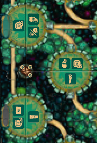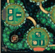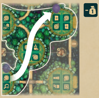 まず、現在いる祠から別の祠に森を通る小道に沿ってあなたのコマを移動させます。1つの祠にはいくつでもコマが存在できます。移動すると、コマが訪れた祠(訳注: スタート地点を除き、通過または到達したすべての祠)ごとに、およびコマが通過した暗い森エリアごとに、1つの食料を消費します(共通サプライに戻します)。